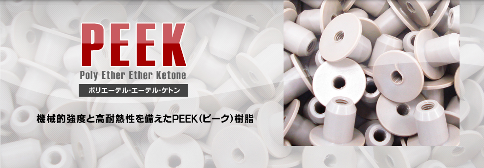PEEK(ピーク)/ポリエーテル・エーテル・ケトンとは、耐熱性(連続使用温度240~260℃)が高く、耐薬品性や耐熱水性優れたスーパーエンジニアプラスチックのことです。また、難燃性や燃焼時の発煙や腐食性ガスの発生も非常に少ない優れた樹脂と注目されています。